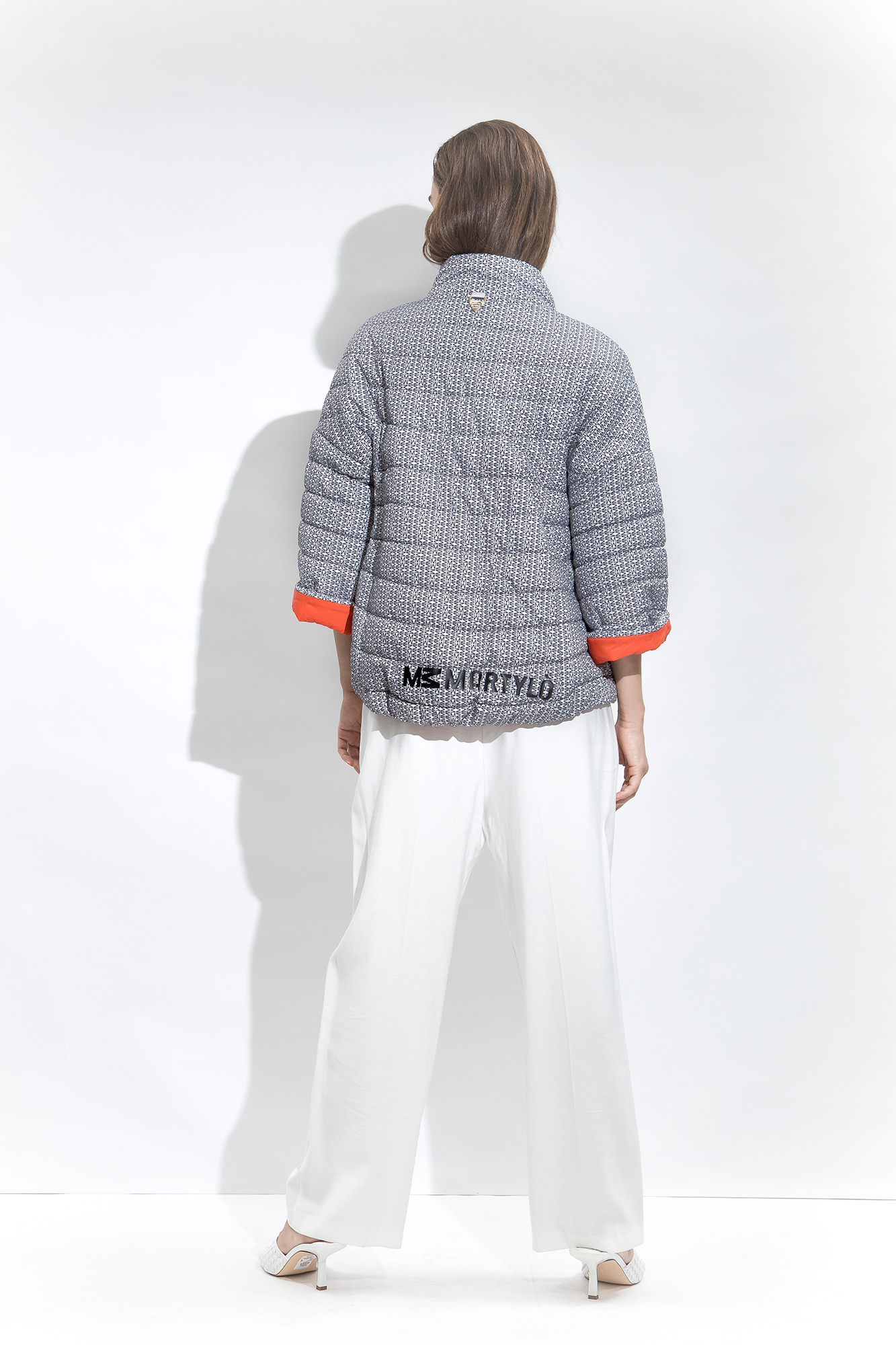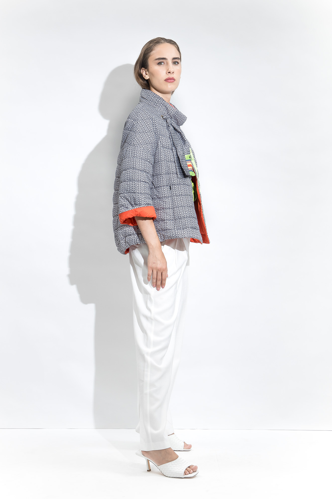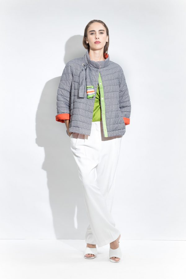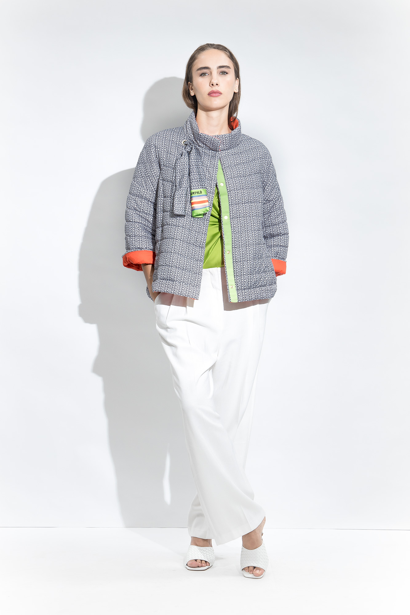 Padded jacket with synthetic padding with logo and colored grosgrain details and scarf tied to two jeweled sails. Modern Chanel style with invisible zips that open the sides and free the back enclosed by an elastic band on the bottom that recalls chic femininity of the sporty woman
