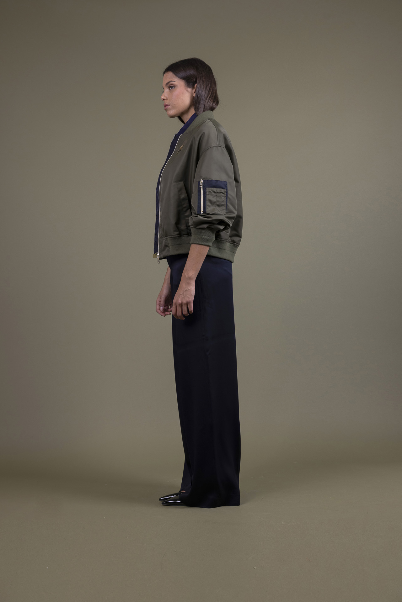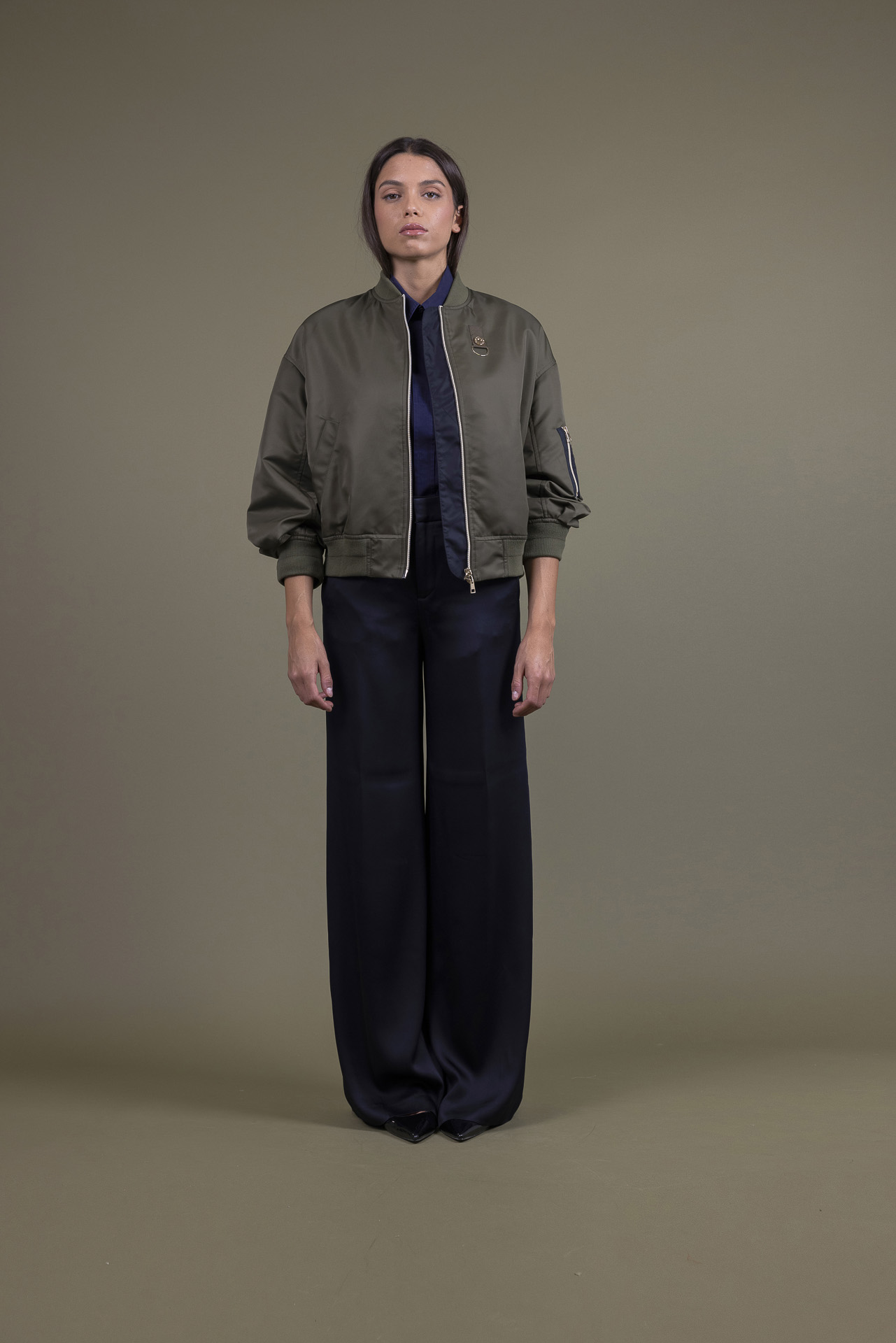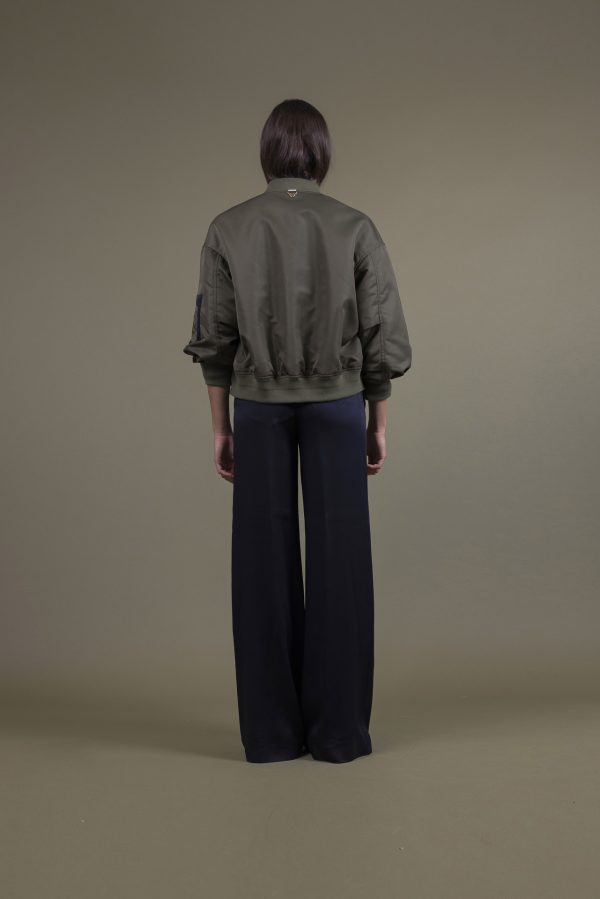 Bomber in tessuto tecnico con leggera imbottitura e fodera unita in contrasto, kit di maglia al collo ai polsi ed al dosso, effetto sport chic della donna Martylò più maschile ma senza rinunciare ai tocchi glamour degli accessori dorati per un Must Have della mezza stagione