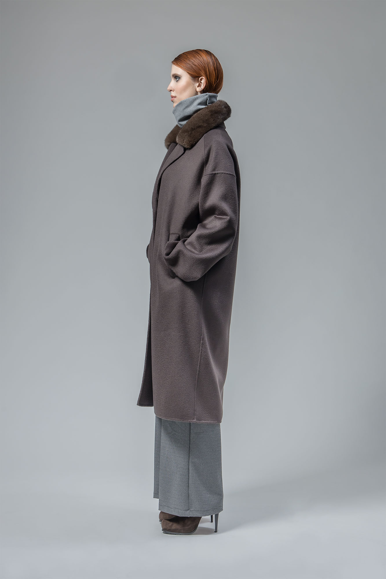 L’estetica minimalista è catturata in questo cappotto marrone tagliato da un lussuoso misto lana e cashmere con collo in pelliccia di visone staccabile. Stile e comfort si uniscono in un capo giovane perfetto per ogni occasione.