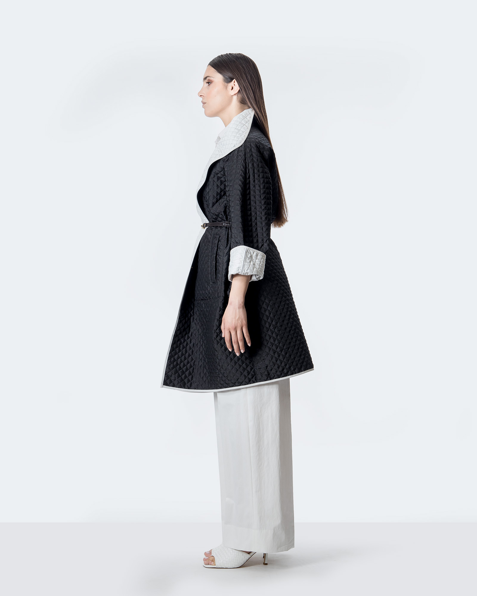 Giacca lunga trapuntata piccolo rombo, doppio colore dal gusto glamour visibile nel risvolto della manica, dettagli di artigianalità nelle cuciture