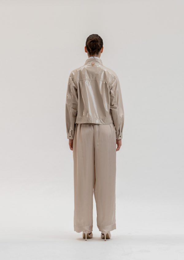 Giacca in tessuto spalmato lucido semplice ma estremamente fashion. Il suo colore naturale darà una sferzata di energia alle lunghe giornate primaverili. È chiuso con zip ed antivento con automatici, con ampie tasche con patte chiuse da automatici, maniche con polso chiuso da automatico. Leggera e facile da indossare questa giacca diventerà il must have immancabile del vostro guardaroba.