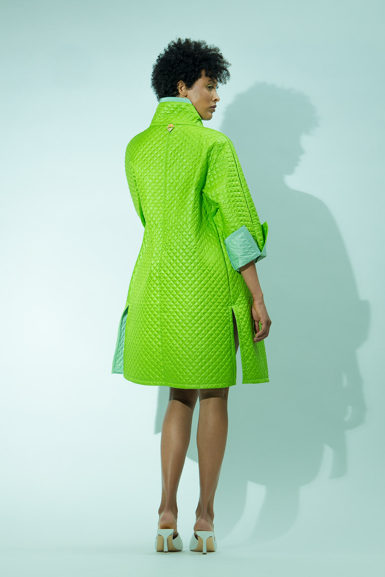 Giacca lunga trapuntata piccolo rombo, doppio colore dal gusto glamour visibile nel risvolto della manica, dettagli di artigianalità nelle cuciture