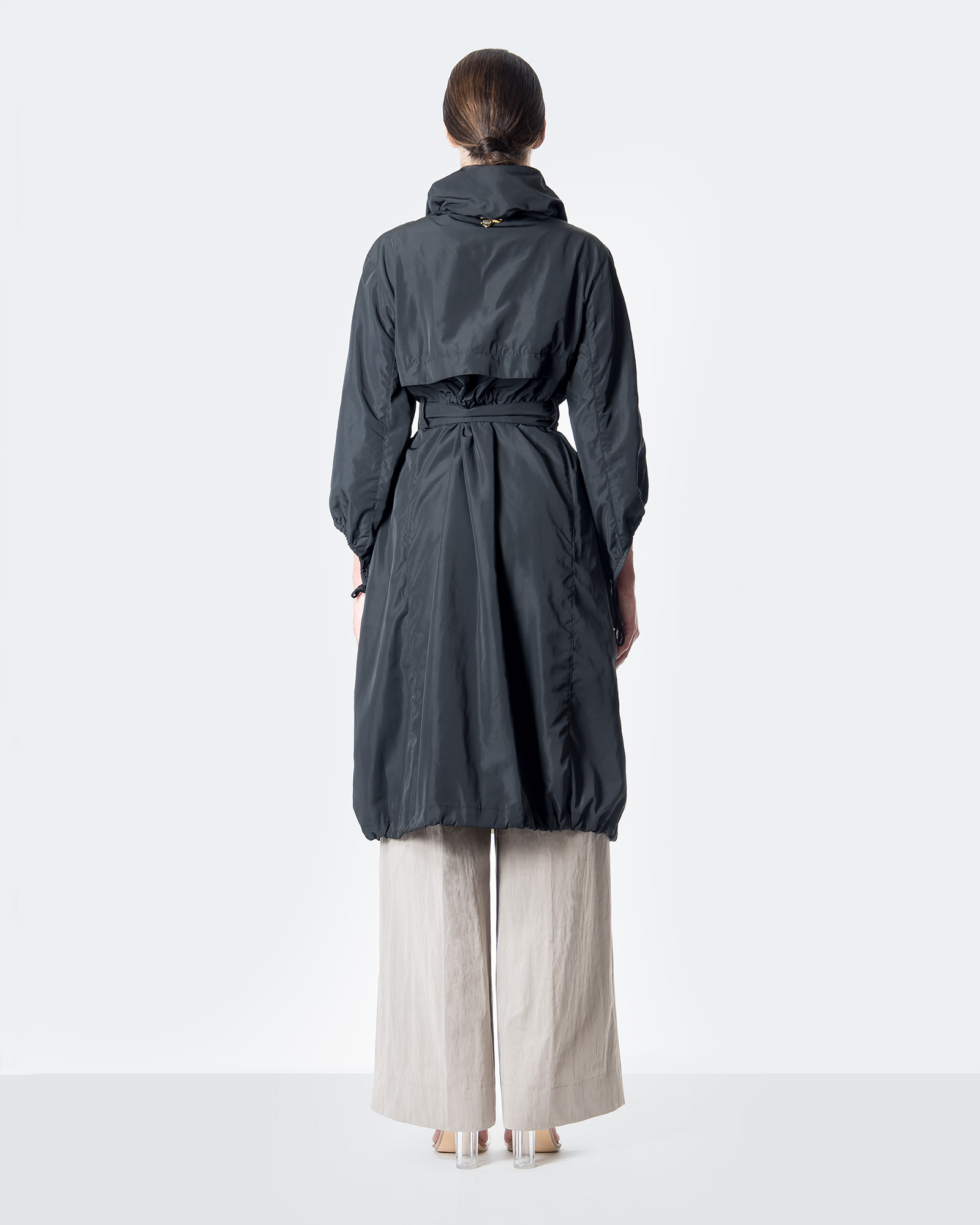 Impermeabile lungo in nylon tecnico dalla linea chic sportiva, tasche a filetto grandi ed importante manica larga rendono lo stile romantico
