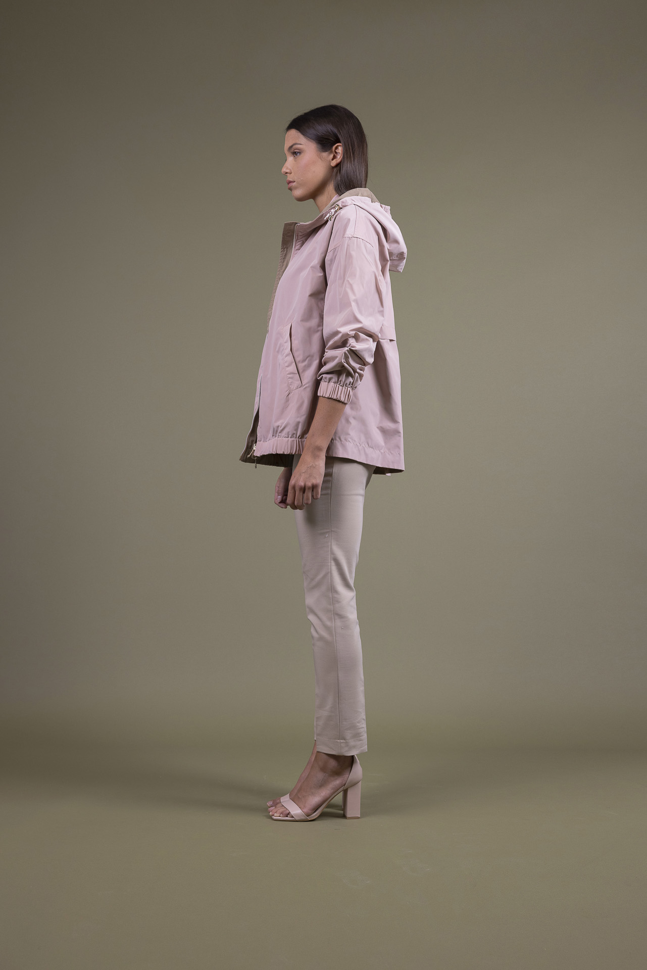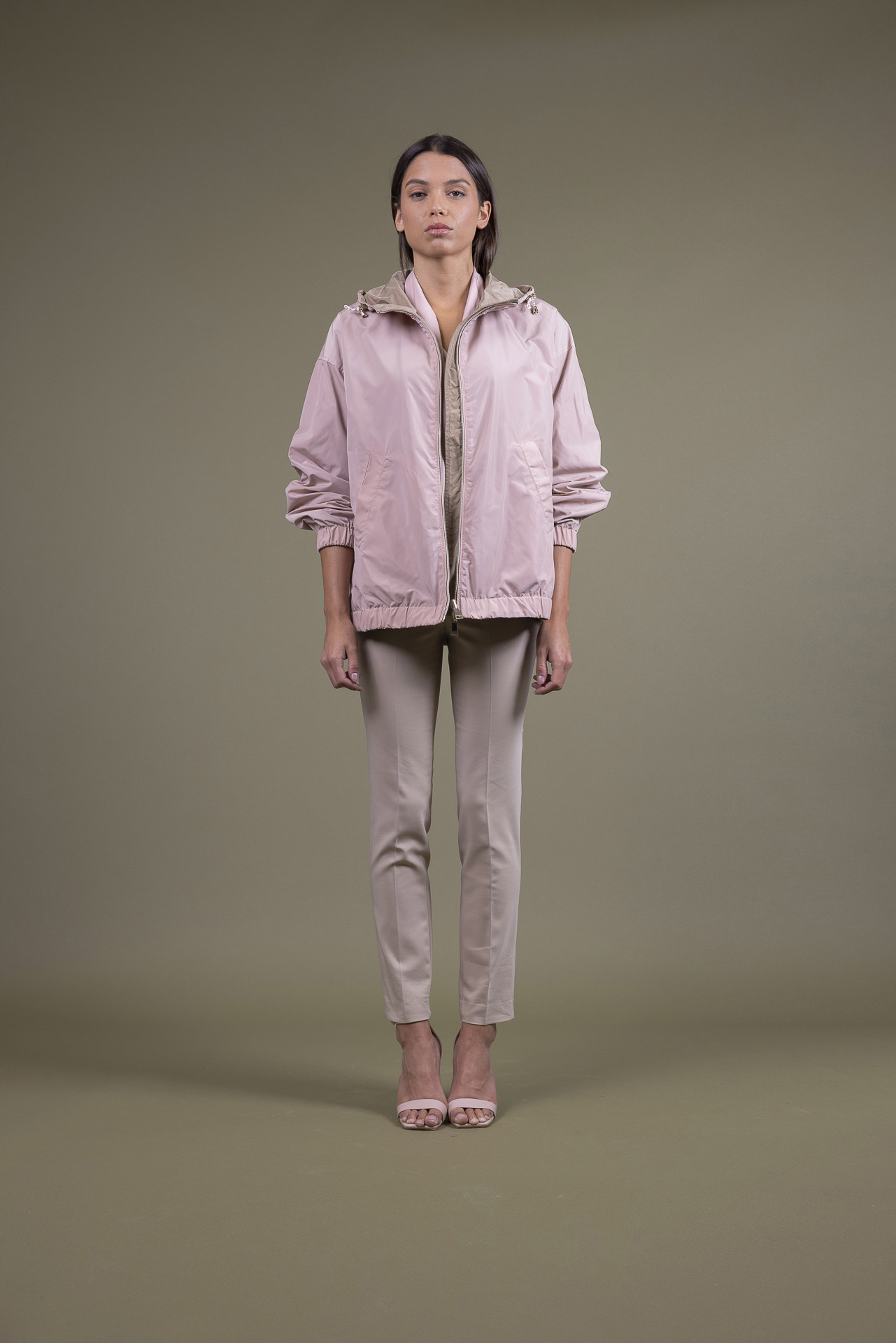 Giacca lunga reversibile con cappuccio sport style realizzata in taffettas tecnico. Il modello ha una linea pulita e versatile che permette di personalizzare il look. Bicolore dal gusto glamour con romantica increspatura sul bordo orlo e manica.