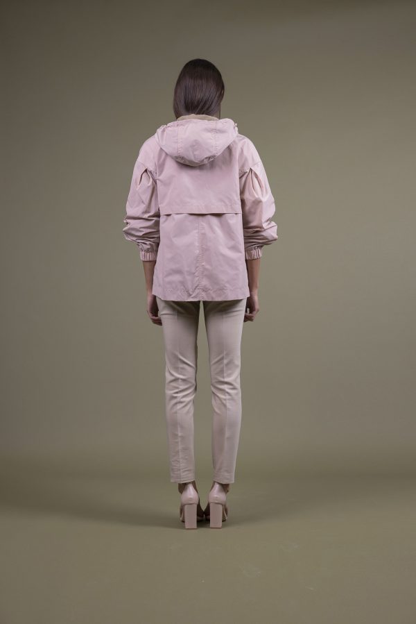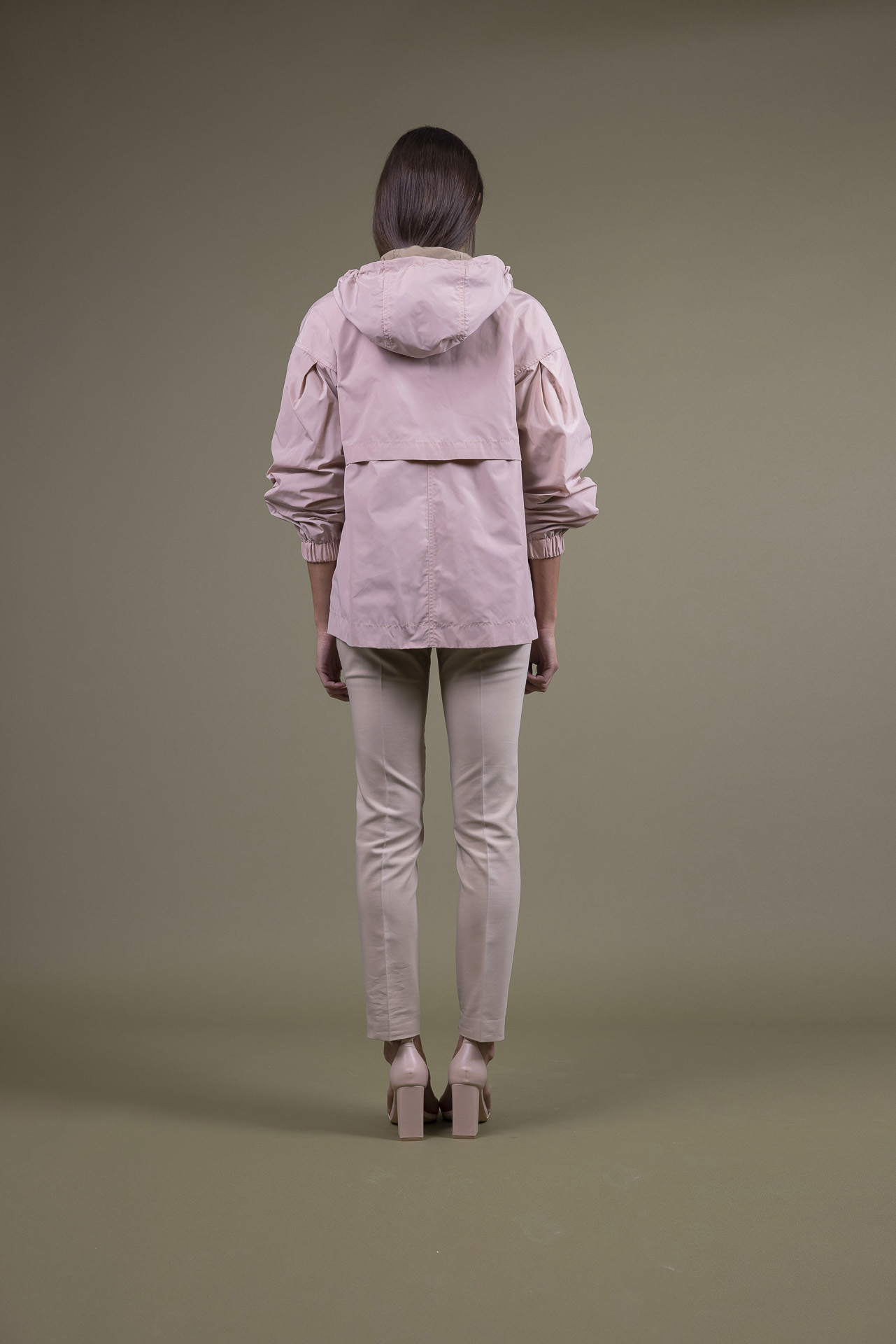 Dettagli: tasche a filetto, mantellina sul dietro e manica con motivo piega cucita, cappuccio con coulisse, elastico orlo e fondo manica