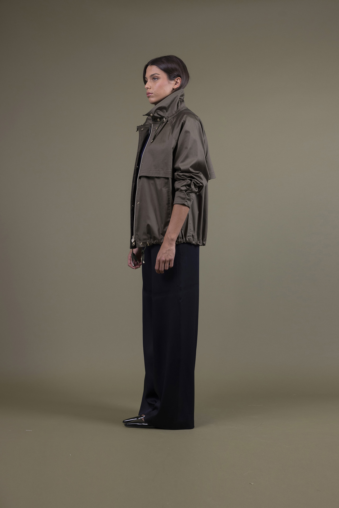 Over coat dal design leggero, per le donne che desiderano sublimare i look quotidiani. Caratterizzata da una vestibilità relaxed, la giacca è realizzata in cotone stretch che combina un effetto tattile morbido con il lucido del visivo. Le coulisse regolabili del collo e del dosso ammorbidiscono il design, consentendo di giocare con la linea della silhouette.