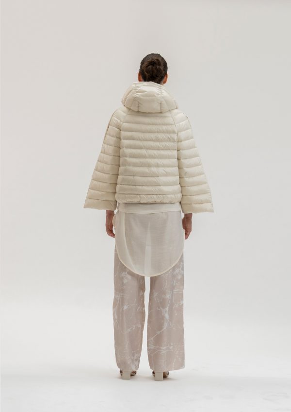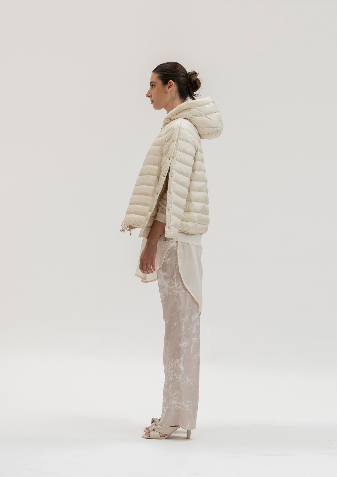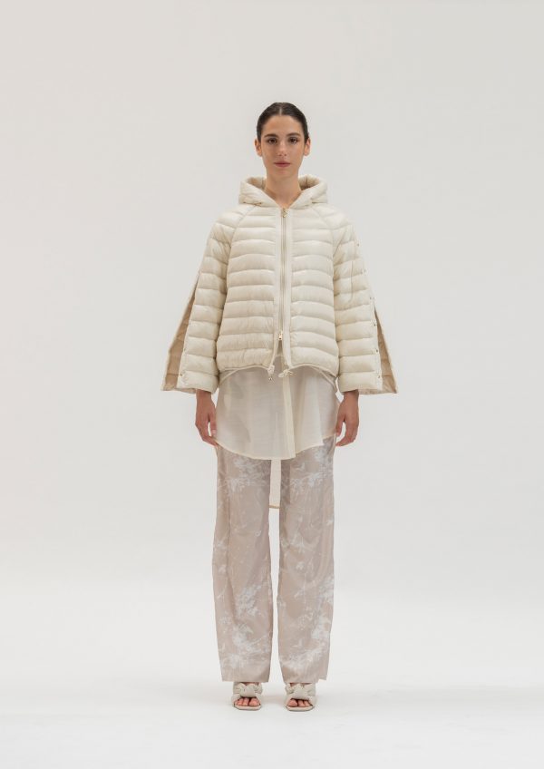 Piumino leggero imbottito in pura piuma d’oca, bicolore con cuciture a righe e con cappuccio. Dalla spalla partono piccoli automatici in oro che permettono la totale apertura della manica donando un gusto glamour. Particolari fashion nelle finiture in gros e coulisse all’orlo del dosso.