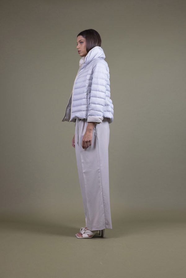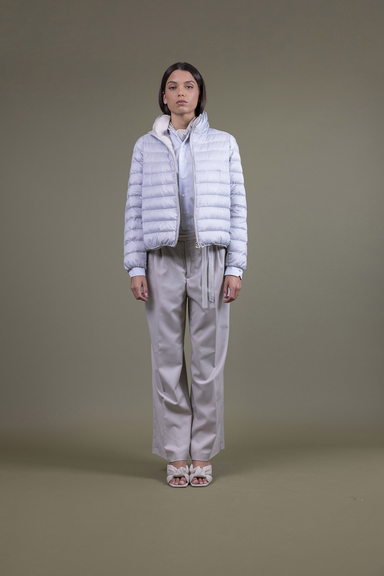 Piumino bicolore leggero imbottito in pura piuma d’oca dall’anima sofisticata. Le proporzioni del capo sono studiate per seguire i movimenti e garantire una vestibilità impeccabile, mentre le finiture con gros grain lo rendono prezioso e chic.