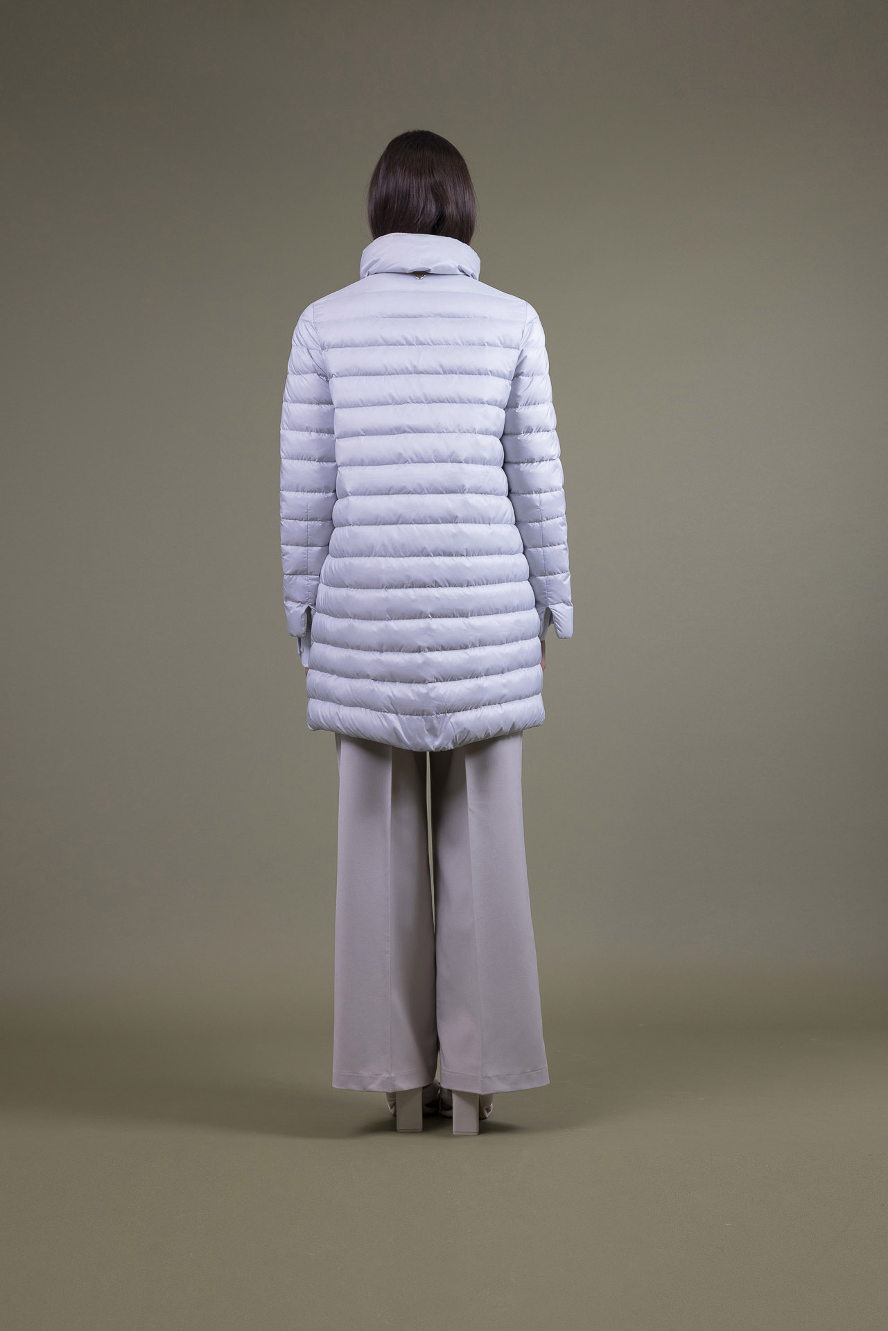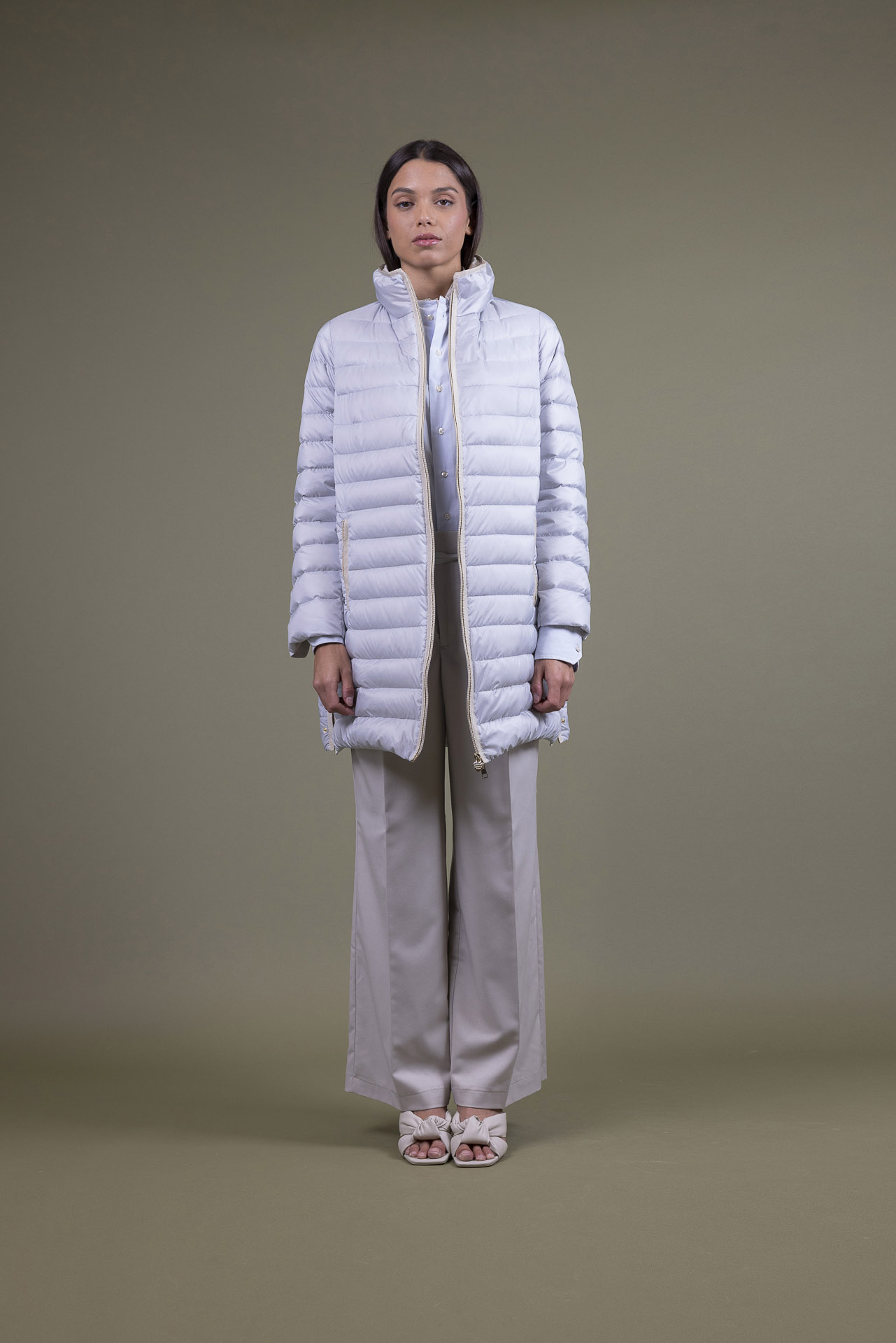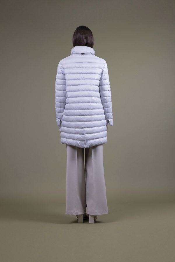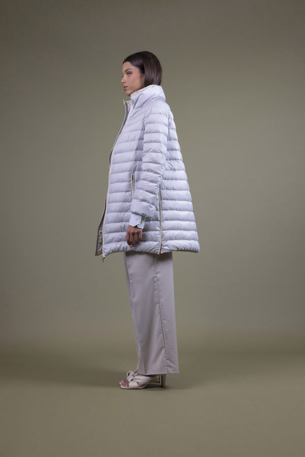 Piumino leggero imbottito in pura piuma d’oca, bicolore con cuciture a righe. Lo stile è reso femminile dai dettagli della linea con una bordatura dal gusto glamour in gros. Una light jacket con ampi spacchi laterali bordati, impensabile non averla.