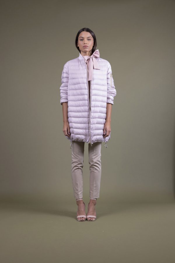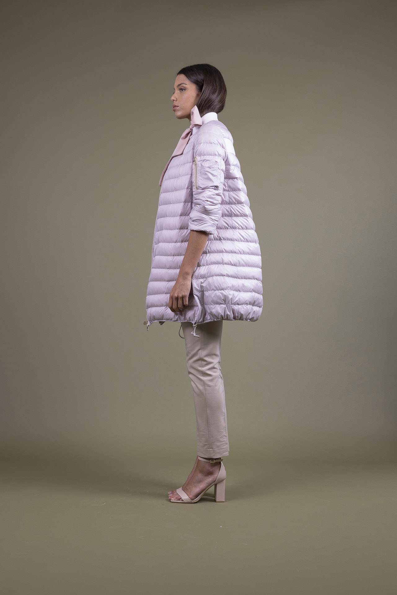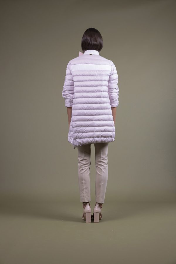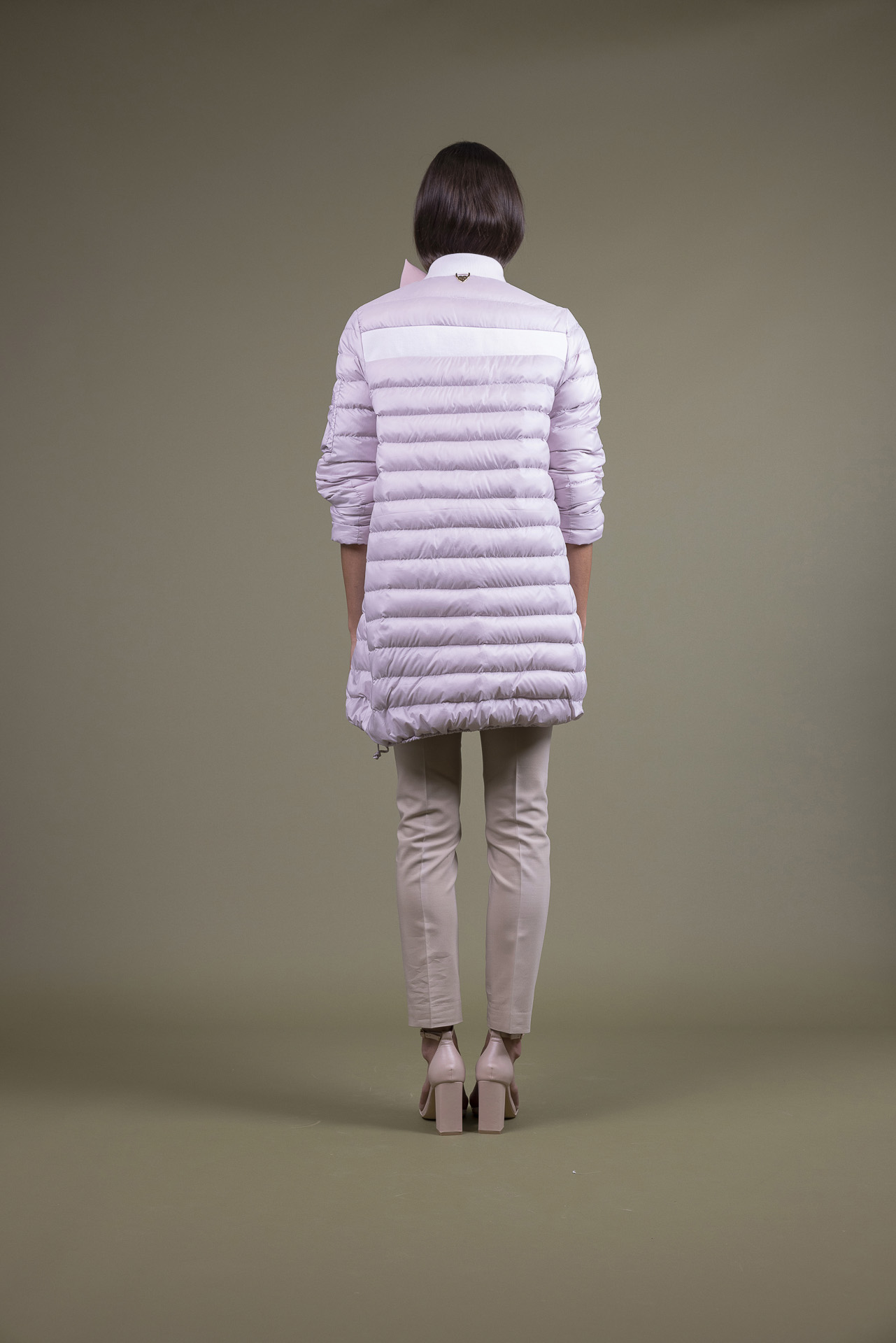 Piumino leggero imbottito in pura piuma d’oca, bicolore con trapuntatura a righe impreziosito da inserti in maglia di jersey e da un taschino con zip sulla manica. Una linea moderna per vestire la comodità della donna Martylò che non rinuncia alla personalità del design.