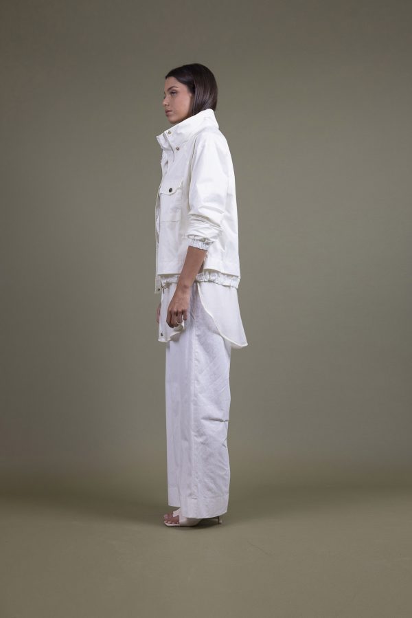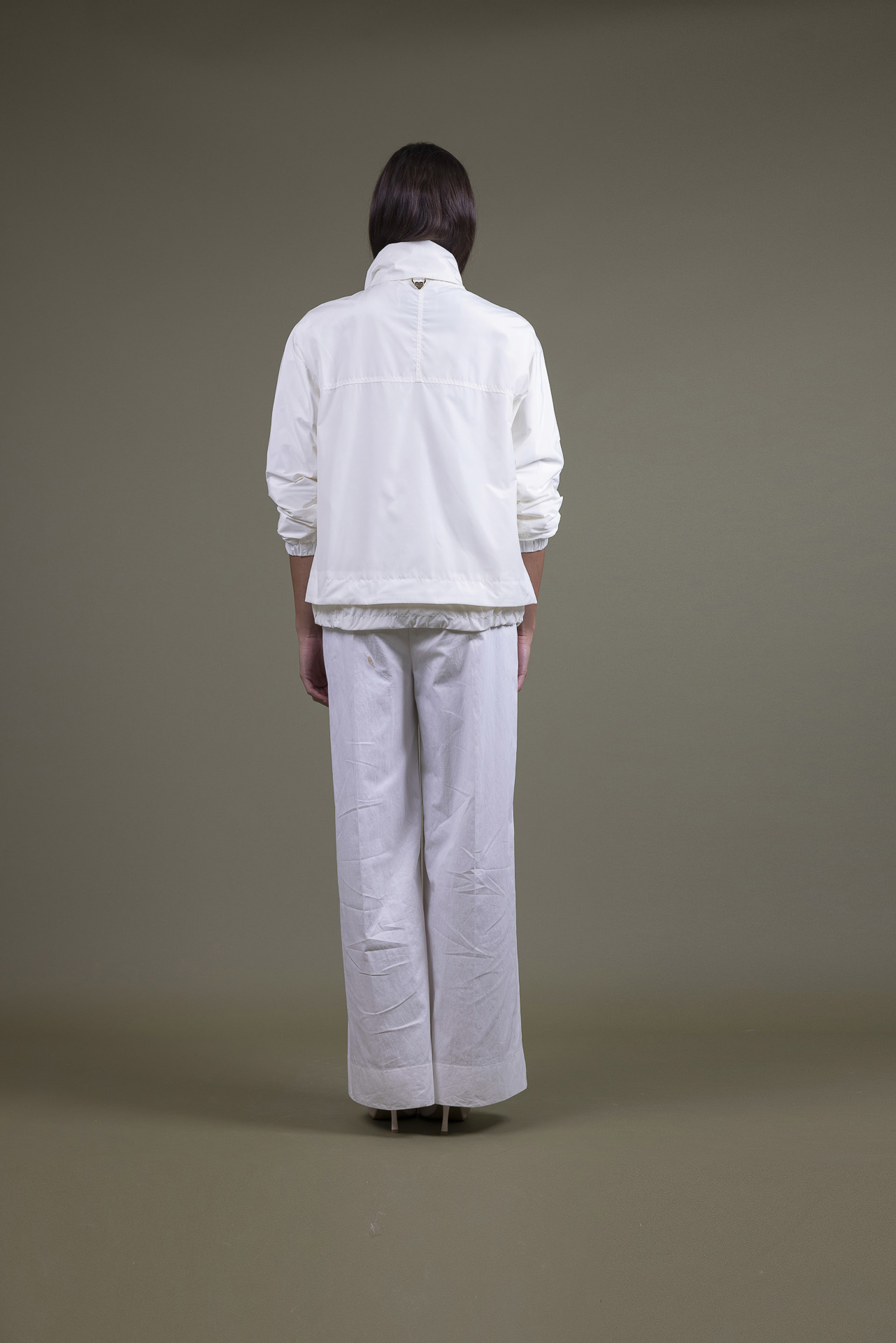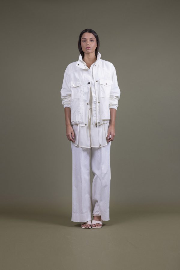 Giacca foderata in taffettas di nylon dal gusto sportivo, ampie tasche con patta ne fanno una versione femminile con la linea che si disegna con la coulisse sul fondo effetto doppia lunghezza. Una light jacket per ogni occasione che sa adattarsi ad ogni look.