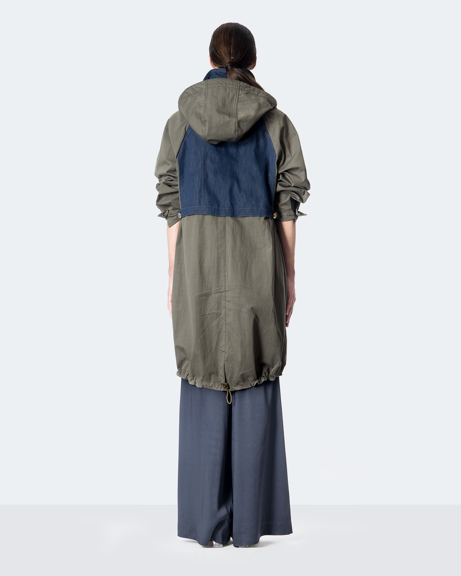 Parka in cotone tecnico e jeans scuro definisce questa linea sportiva e chic, cappuccio staccabile e coulisse ne delineano la femminilità