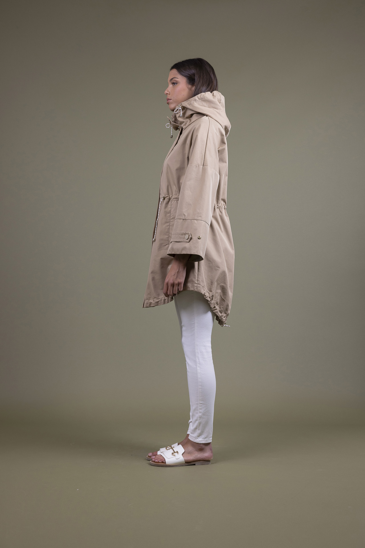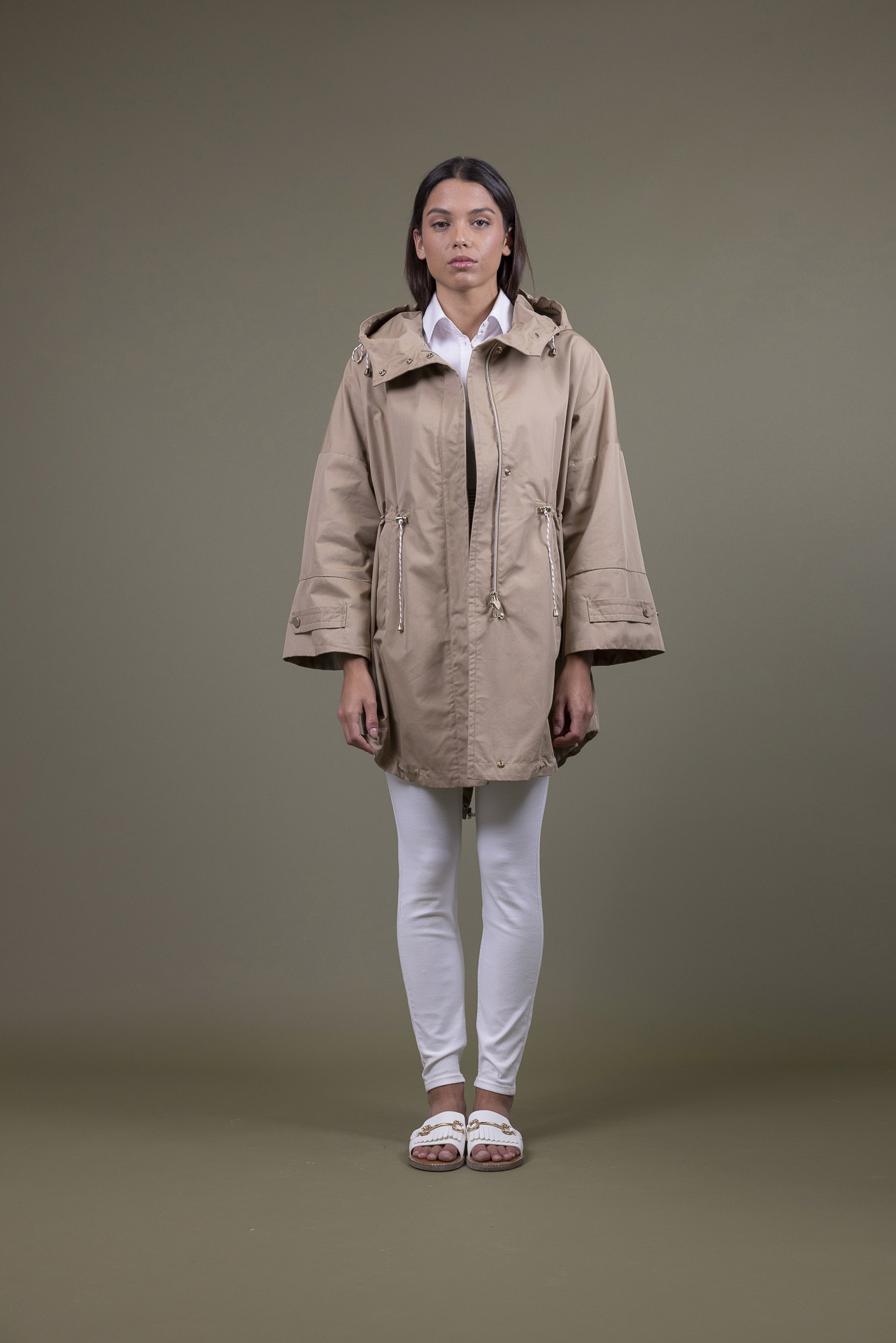 Dettagli: tasche con ampio filetto, coulisse con regolatori al cappuccio ed alla vita, laccio regolatore ampiezza al polso, spacco fondo orlo, cuciture bordate da micro riga, cintura di tessuto