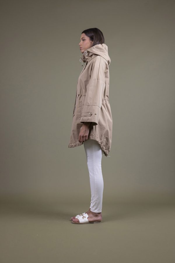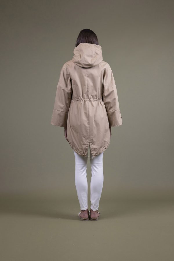Parka in tessuto tecnico con mezza fodera micro righe, cappuccio con coulisse regolabile e manica che si allarga sul fondo dove si trova un laccio con automatico che ne regola l’ampiezza. Coulisse in vita sempre regolabile che lo arricchisce e lo rende adatto