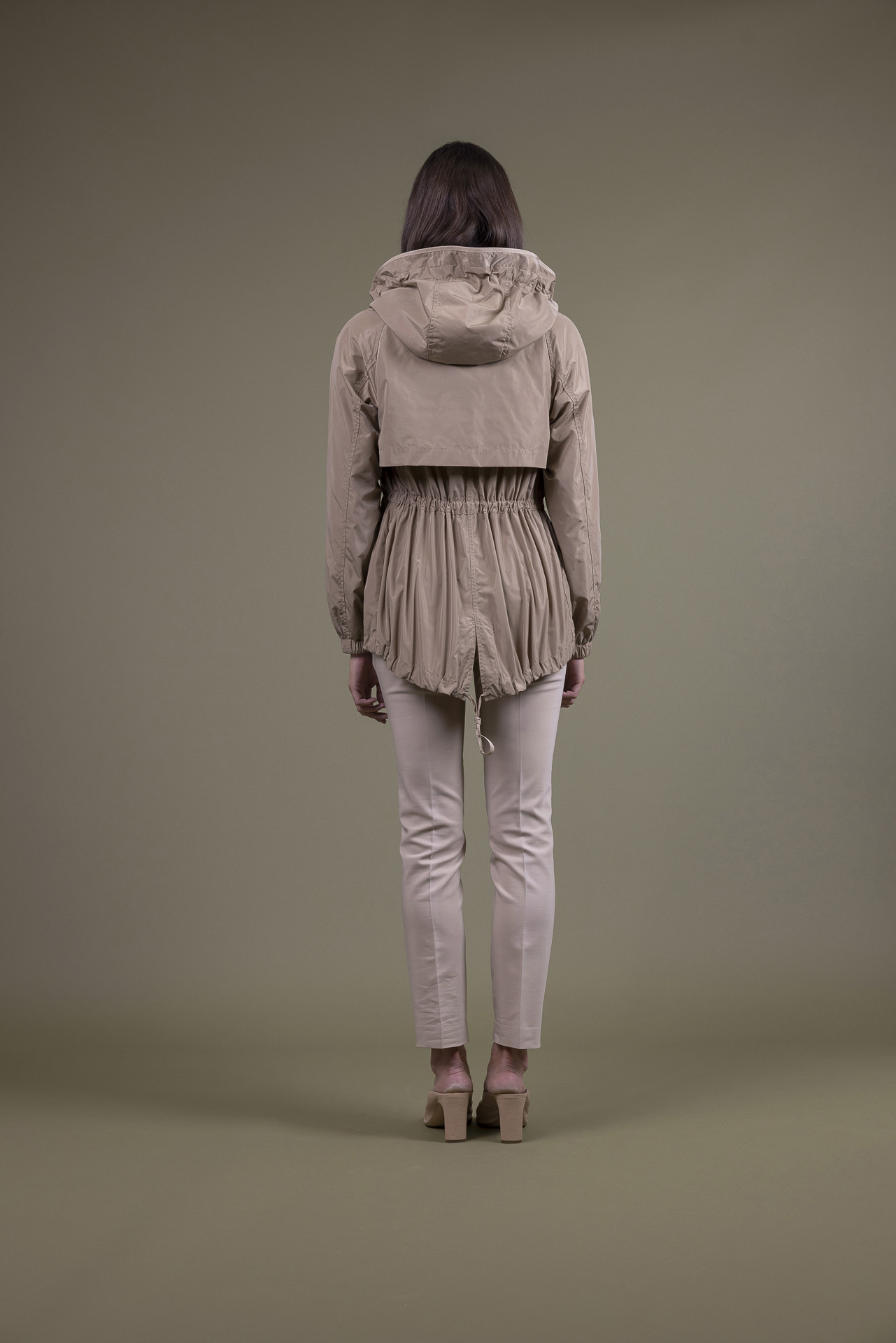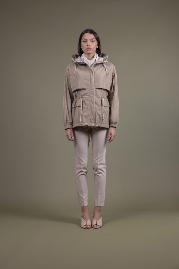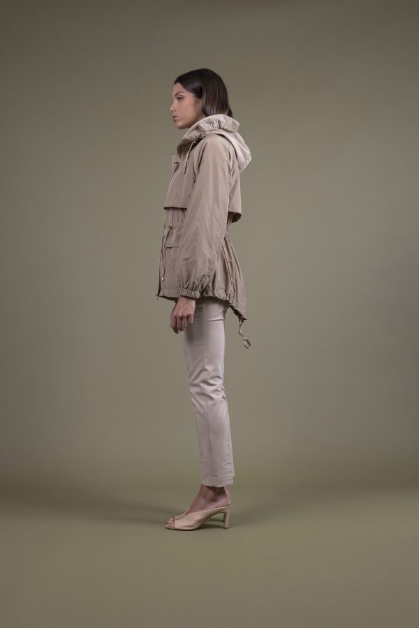 Dettagli: mezza fodera in micro riga, coulisse regolabile in vita, coulisse regolabile all’orlo, cappuccio