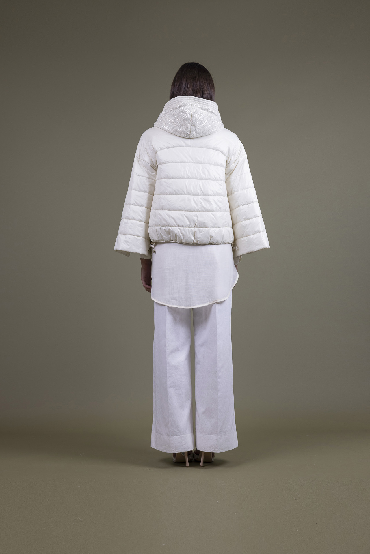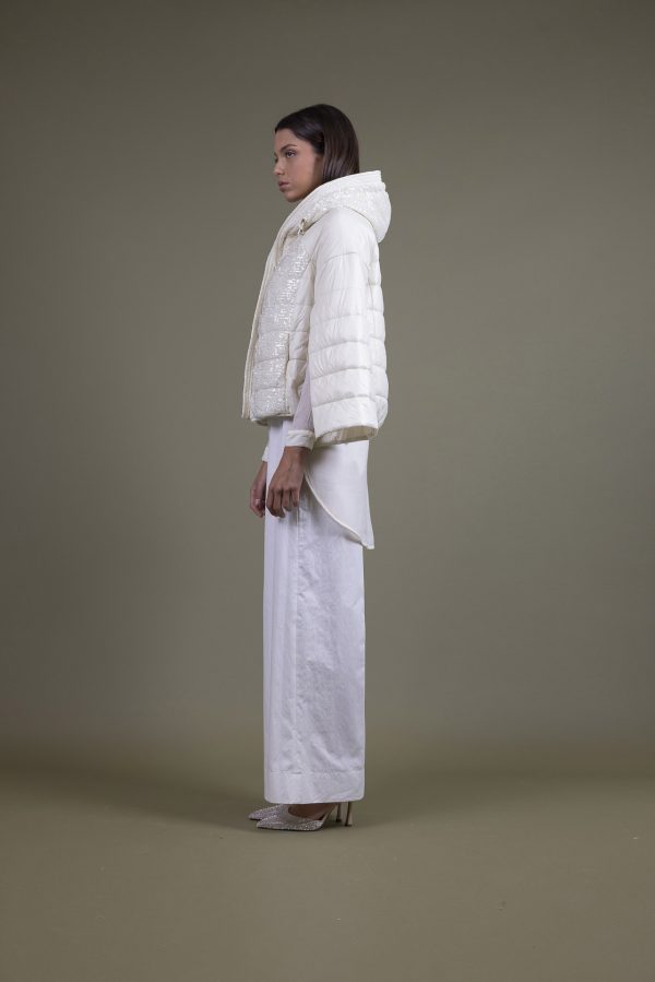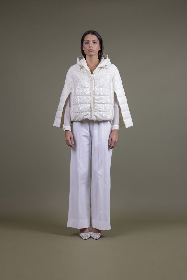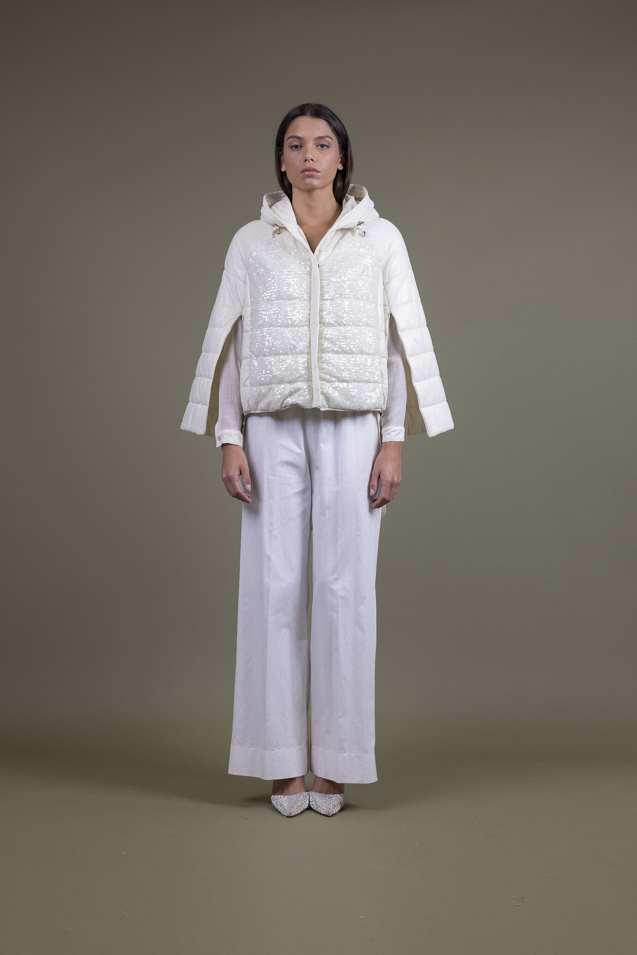 Incontro tra l’iconico nylon tecnico Martylò e la luce delle pailettes cucite sul tulle in questo grazioso e super stiloso piumino sintetico con tagli e dettagli che ne disegnano la linea. Romantico cuore tirazip iconico Martylò e le coulisse regolabili impreziosite da accessori dorati lo rendono una coccola della mezza stagione.