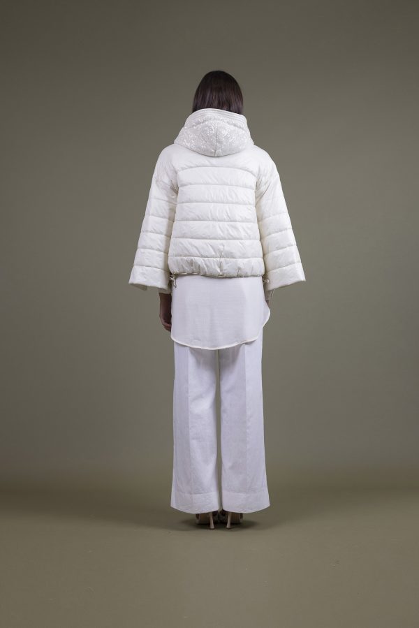 Dettagli: tasche con zip invisibile, cappuccio e dosso con coulisse regolabile, zip invisibile sul fondo manica