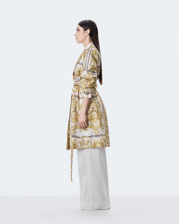 Trench in cotone tecnico stampato doppio petto con ampie maniche romantiche strette da lacci al polso